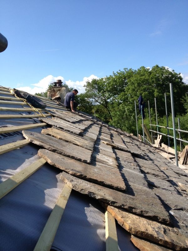 Wenning Hipping, Clapham – Nearing completion of the Yorkshire stone slating to the main roof incorparating re-cycled insulation to comply with Building Code regulations, tanalised laths, permeable breatherable felt, UPVC eave course trays and sourcing reclaimed Yorkshire stone slates.